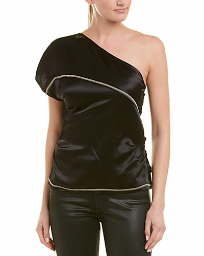 - Design details: satin one-shoulder style, dolman sleeves, contrast topstitching