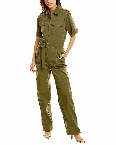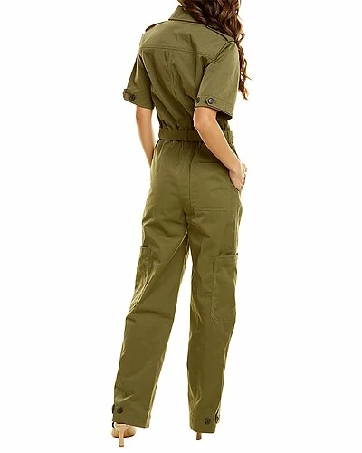 - Utility Jumpsuit in burnt olive with spread collar, strap details at shoulders and cuffs, dual chest pockets, elasticized belted waist, pleated leg, dual side seam pockets, dual side cargo pockets and back right pocket